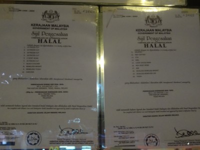 マラッカ名物のニョニャ料理(マレー料理と中華料理が融合したような料理)は、もともとイスラム教がNGとする豚肉なども使う料理なのですが、そんなお店にも今やハラルマーク。2枚も掲示してありました。じゃーん。