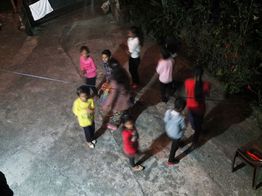 ティハールは子どもたちにとっても特別なイベントみたい。夜、サンタナで夕ごはんをいただいていると、下から何やら賑やかなさわぎ声と音楽が聞こえてきます。ひょいっとベランダから覗くと、子どもたちが踊ってる!